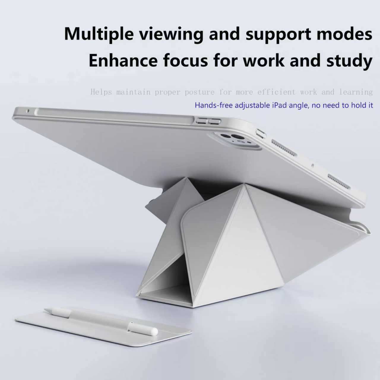The tri-fold front cover doubles as a stable stand for typing, viewing, or drawing — perfect for work or entertainment. -