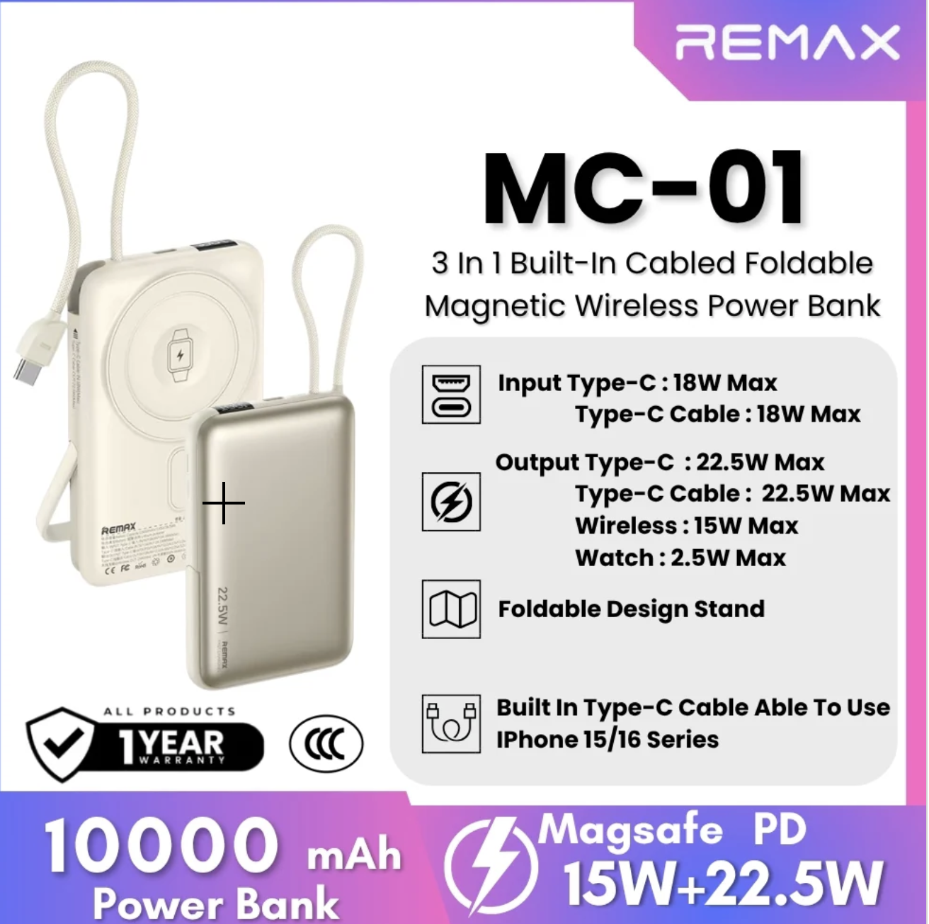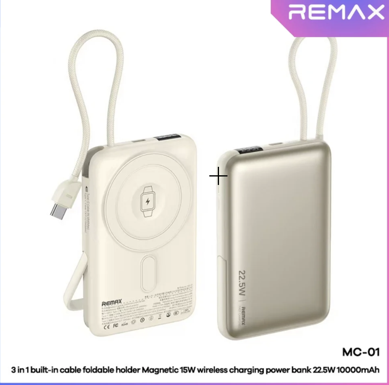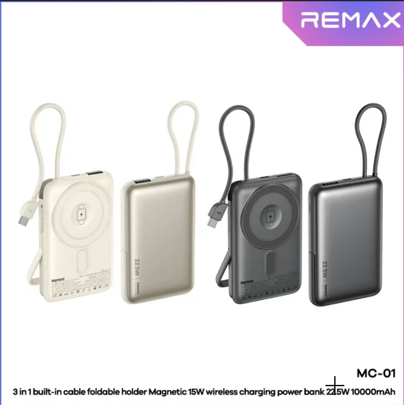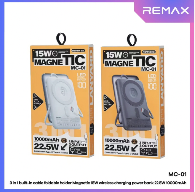 REMAX – MC-01 10000mAh 3 In 1 Cabled Foldable Magnetic Wireless Charging Power Bank (PD22.5W+Magsafe15W)